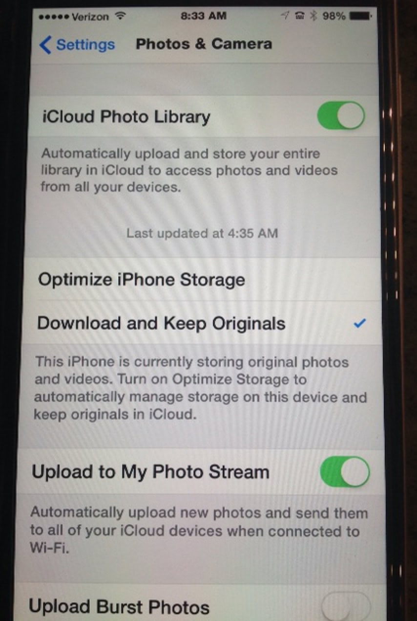 then inside in the first section related to ” iCloud Photo Library ” make sure you have this selected: