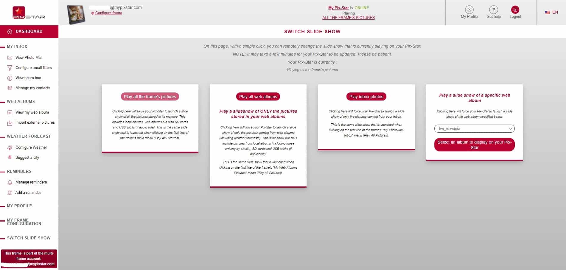 One of the most useful things you’ll learn from how to use the Pix-Star web dashboard is the slideshow switch function. Here you change a current slideshow to show pictures from various sources such as web albums (you can choose which web albums), photo-mail, custom albums, and much more.