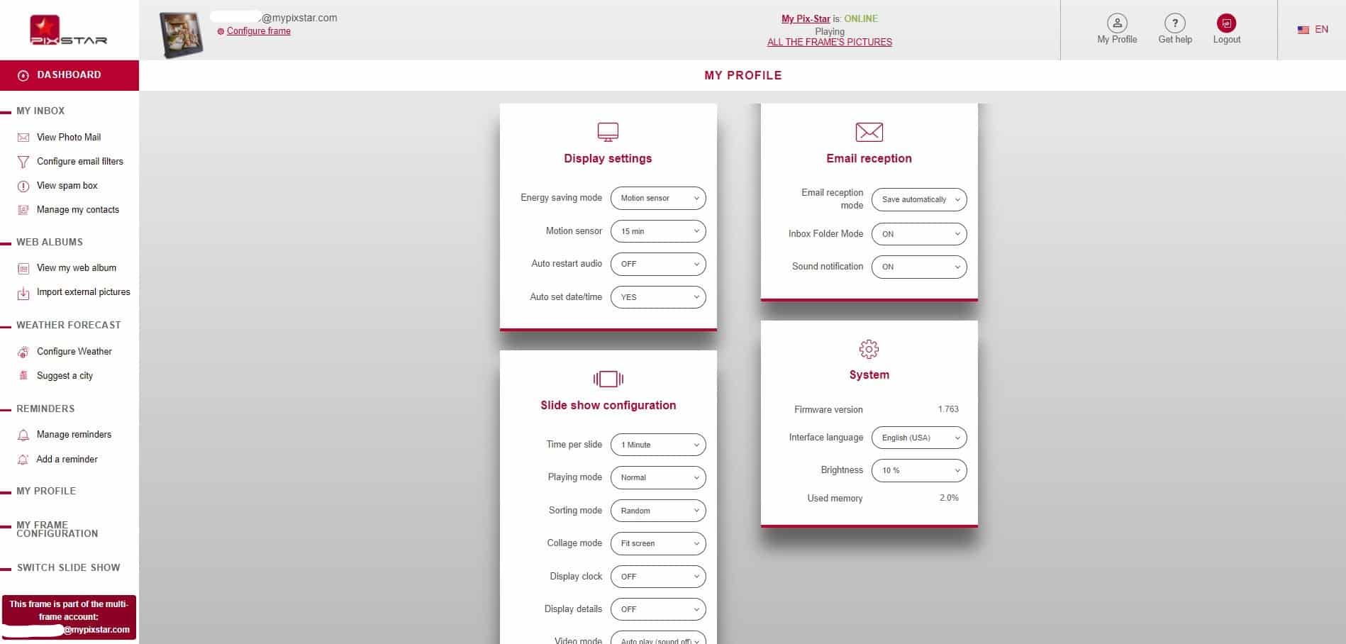 When you arrive at your frame’s web dashboard, take a couple of minutes to get familiar with the layout of the options, controls, and settings. Head over to the “My profile” section at the top right corner of the screen and make sure all your information is correct.