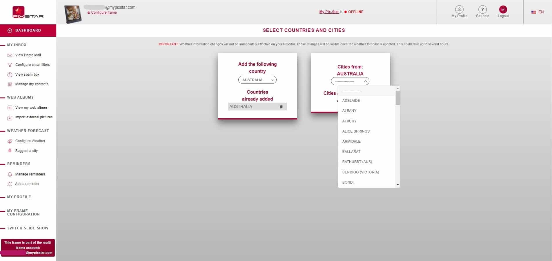 If you have already registered a frame, and want to register several frames to the same account, you can use the same process. You’ll be granted access to a multi-frame control account feature when you purchase two or more Pix-Star frames. It’s easy to set up and lets you control several Pix-Star frames at the same time from one user account, from anywhere in the world. - Login into your Pix-Star frame’s web dashboard